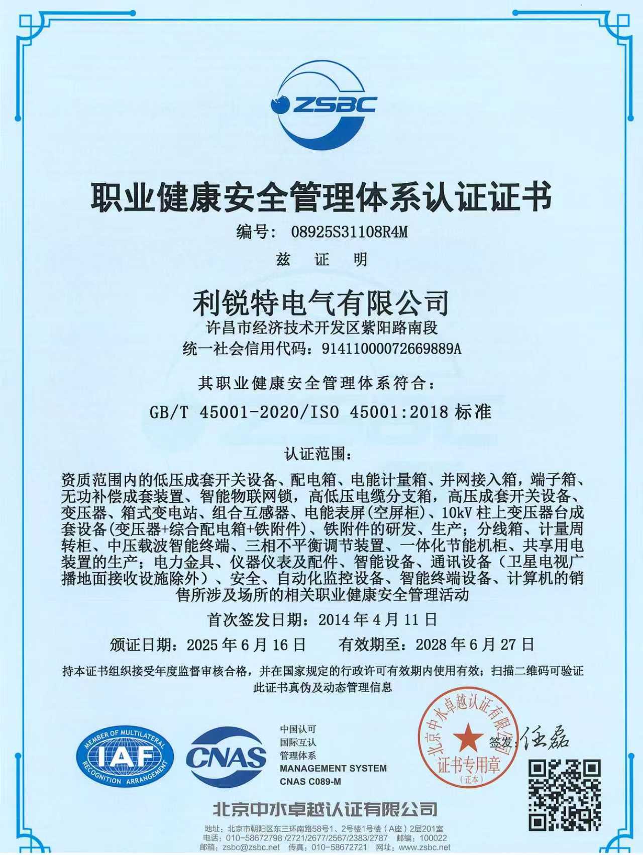职业健康安全管理体系认证证书