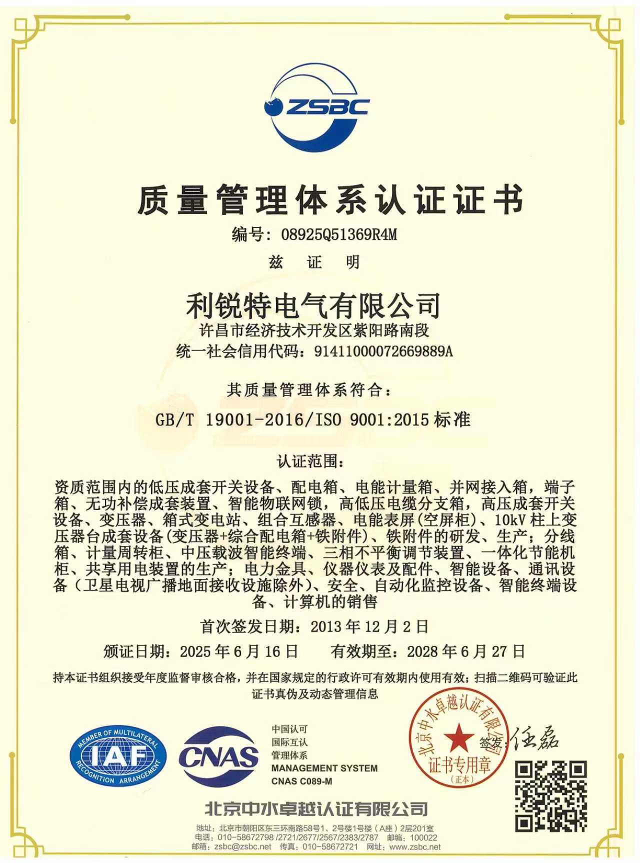 质量管理体系认证证书